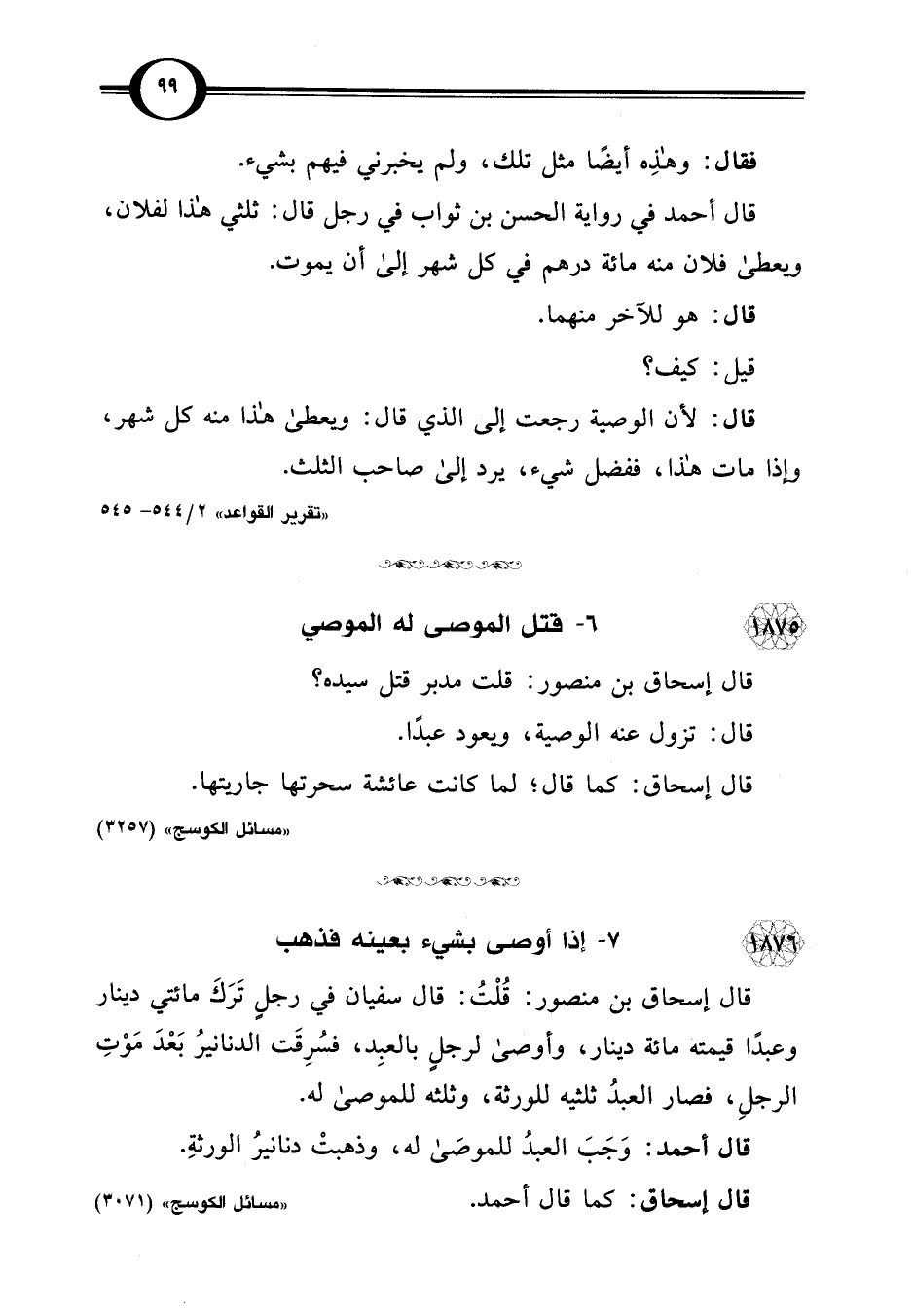 قال إسحاق بن منصور: قُلْتُ: قال سفيان في رجلٍ تَرَكَ مائتي دينار وعبدًا قيمته مائة دينار، وأوصى لرجلٍ بالعبِد، فسُرِقَت الدنانيرُ بَعْدَ مَوْتِ الرجلِ، فصار العبدُ ثلثيه للورثة، وثلثه للموصى له.