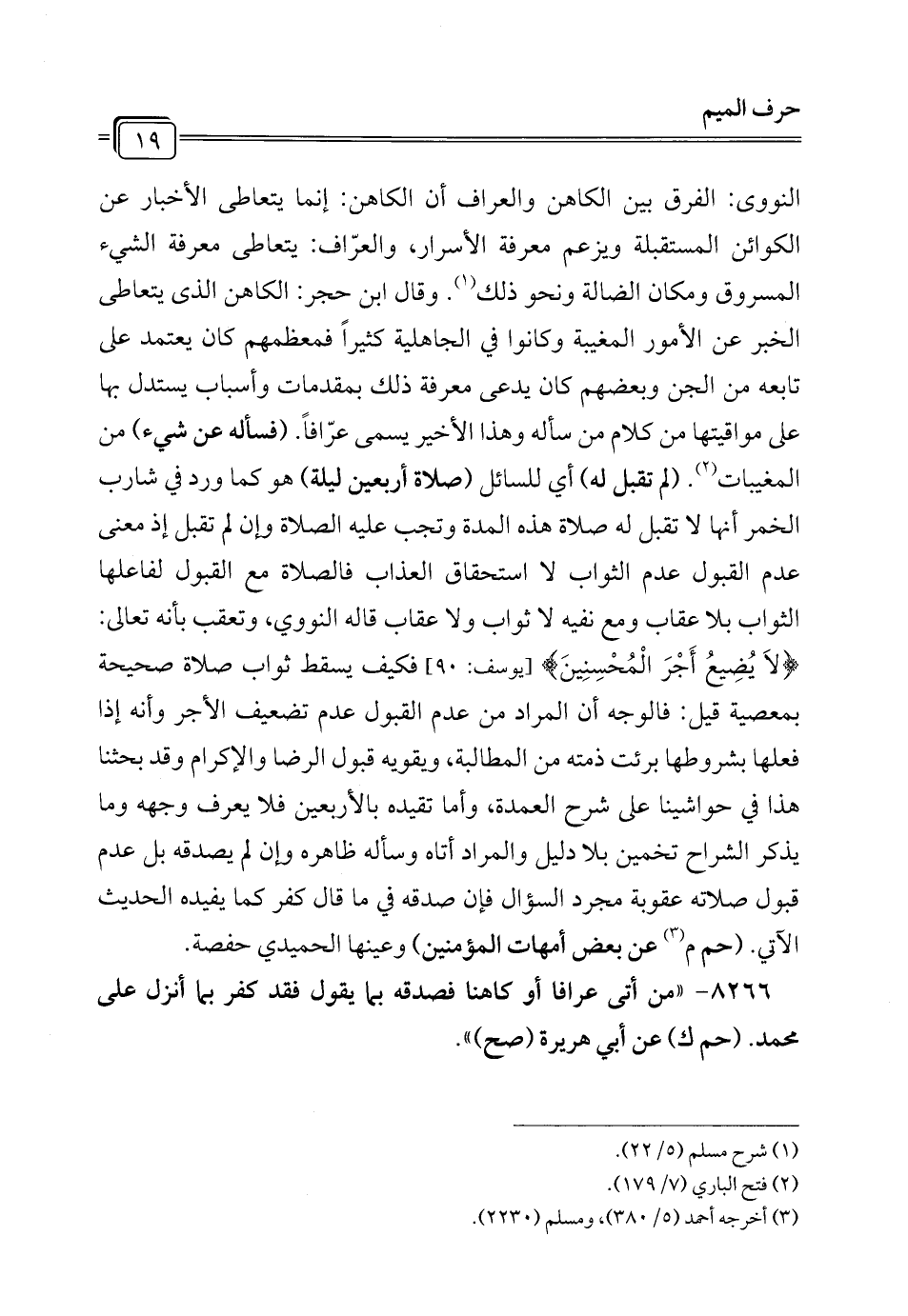 النووى: الفرق بين الكاهن والعراف أن الكاهن: إنما يتعاطى الأخبار عن الكوائن المستقبلة ويزعم معرفة الأسرار، والعرّاف: يتعاطى معرفة الشيء المسروق ومكان الضالة ونحو ذلك (¬1). وقال ابن حجر: الكاهن الذي يتعاطى الخبر عن الأمور المغيبة وكانوا في الجاهلية كثيراً فمعظمهم كان يعتمد على تابعه من الجن وبعضهم كان يدعى معرفة ذلك بمقدمات وأسباب يستدل بها على مواقيتها من كلام من سأله وهذا الأخير يسمى عرّافاً. (فسأله عن شيء) من المغيبات (¬2) (لم تقبل له) أي للسائل (صلاة أربعين ليلة) هو كما ورد في شارب الخمر أنها لا تقبل له صلاة هذه المدة وتجب عليه الصلاة وإن لم تقبل إذ معنى عدم القبول عدم الثواب لا استحقاق العذاب فالصلاة مع القبول لفاعلها الثواب بلا عقاب ومع نفيه لا ثواب ولا عقاب قاله النووي، وتعقب بأنه تعالى: {لاَ يُضِيعُ أَجْرَ الْمُحْسِنِينَ} [يوسف: 90] فكيف يسقط ثواب صلاة صحيحة بمعصية قيل: فالوجه أن المراد من عدم القبول عدم تضعيف الأجر وأنه إذا فعلها بشروطها برئت ذمته من المطالبة، ويقويه قبول الرضا والإكرام وقد بحثنا هذا في حواشينا على شرح العمدة، وأما تقيده بالأربعين فلا يعرف وجهه وما يذكر الشرل تخمين بلا دليل والمراد أتاه وسأله ظاهره وإن لم يصدقه بل عدم قبول صلاته عقوبة مجرد السؤال فإن صدقه في ما قال كفر كما يفيده الحديث الآتي. (حم م (¬3) عن بعض أمهات المؤمنين) وعينها الحميدي حفصة.