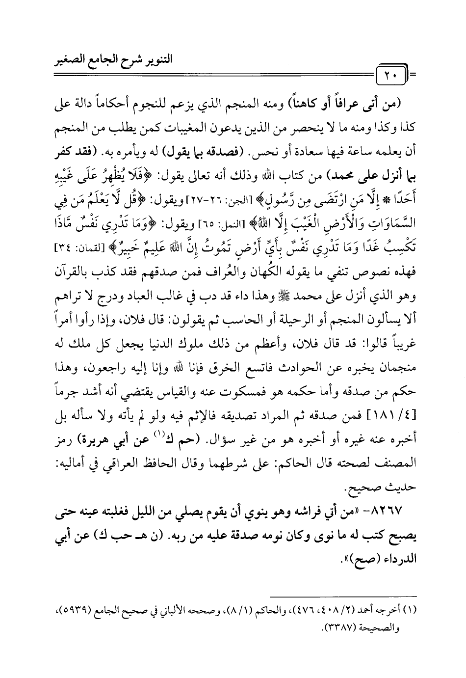 (من أتى عرافاً أو كاهناً) ومنه المنجم الذي يزعم للنجوم أحكاماً دالة على كذا وكذا ومنه ما لا ينحصر من الذين يدعون المغيبات كمن يطلب من المنجم أن يعلمه ساعة فيها سعادة أو نحس. (فصدقه بما يقول) له ويأمره به. (فقد كفر بما أنزل على محمَّد) من كتاب الله وذلك أنه تعالى يقول: {فَلَا يُظْهِرُ عَلَى غَيْبِهِ أَحَدًا (26) إِلَّا مَنِ ارْتَضَى مِنْ رَسُولٍ} [الجن: 26، 27] ويقول: {قُلْ لَا يَعْلَمُ مَنْ فِي السَّمَاوَاتِ وَالْأَرْضِ الْغَيْبَ إِلَّا اللَّهُ} [النمل: 65] ويقول: {وَمَا تَدْرِي نَفْسٌ مَاذَا تَكْسِبُ غَدًا وَمَا تَدْرِي نَفْسٌ بِأَيِّ أَرْضٍ تَمُوتُ إِنَّ اللَّهَ عَلِيمٌ خَبِيرٌ} [لقمان: 34] فهذه نصوص تنفي ما يقوله الكُهان والعُراف فمن صدقهم فقد كذب بالقرآن وهو الذي أنزل على محمَّد - صلى الله عليه وسلم - وهذا داء قد دب في غالب العباد ودرج لا تراهم ألا يسألون المنجم أو الرحيلة أو الحاسب ثم يقولون: قال فلان، وإذا رأوا أمراً غريباً قالوا: قد قال فلان، وأعظم من ذلك ملوك الدنيا يجعل كل ملك له منجمان يخبره عن الحوادث فاتسع الخرق فإنا لله وإنا إليه راجعون، وهذا حكم من صدقه وأما حكمه هو فمسكوت عنه والقياس يقتضي أنه أشد جرماً [4/ 181] فمن صدقه ثم المراد تصديقه فالإثم فيه ولو لم يأته ولا سأله بل أخبره عنه غيره أو أخبره هو من غير سؤال. (حم ك (¬1) عن أبي هريرة) رمز المصنف لصحته قال الحاكم: على شرطهما وقال الحافظ العراقي في أماليه: حديث صحيح.
