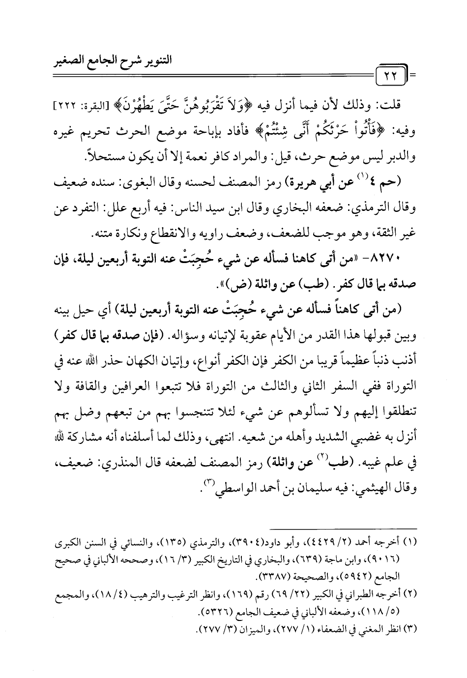 (¬2) أخرجه الطبراني في الكبير (22/ 69) رقم (169)، وانظر الترغيب والترهيب (4/ 18)، والمجمع (5/ 118)، وضعفه الألباني في ضعيف الجامع (5326).