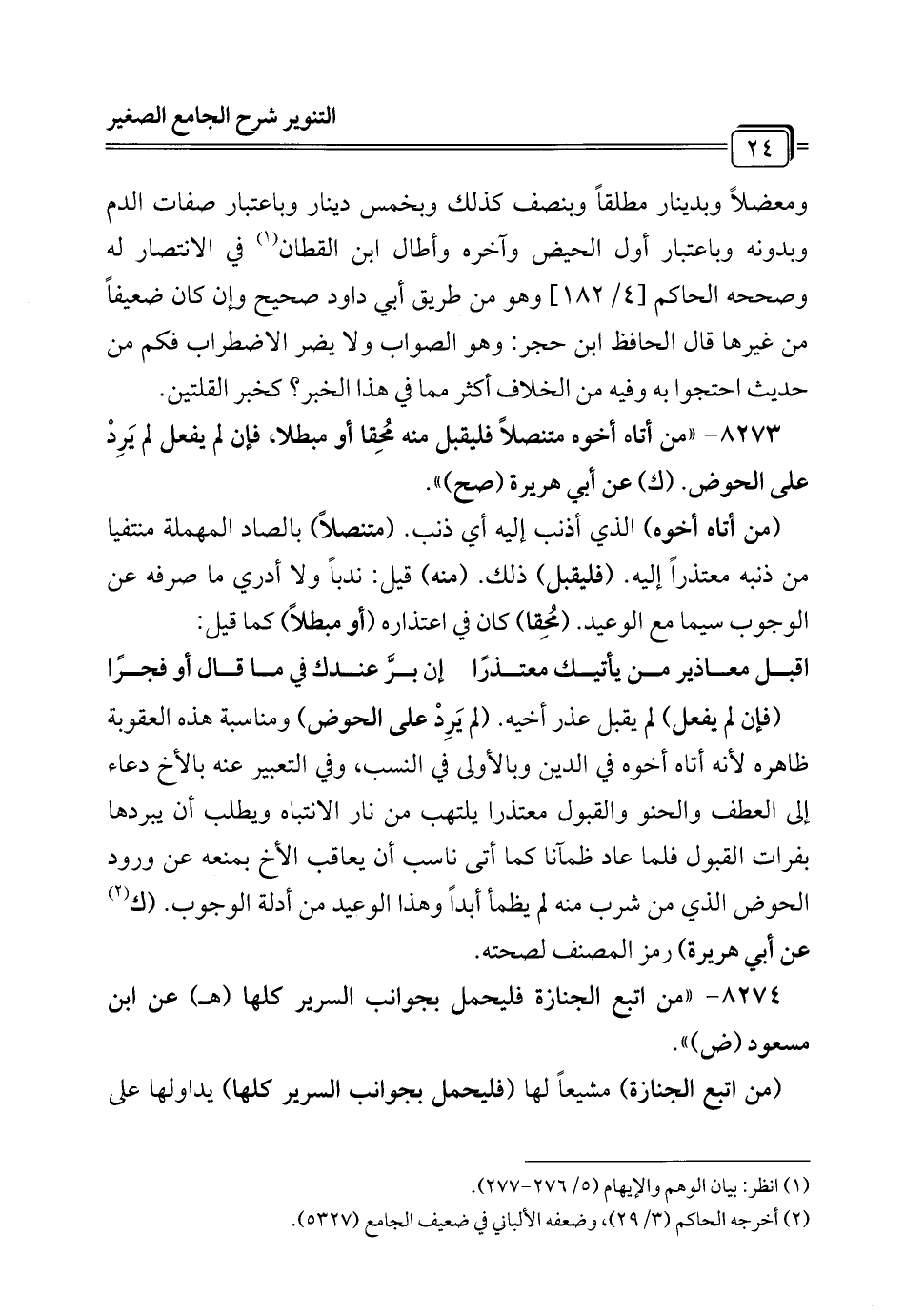 8273 - "من أتاه أخوه متنصلاً فليقبل منه مُحِقا أو مبطلا، فإن لم يفعل لم يَرِدْ على الحوض. (ك) عن أبي هريرة (صح) ".