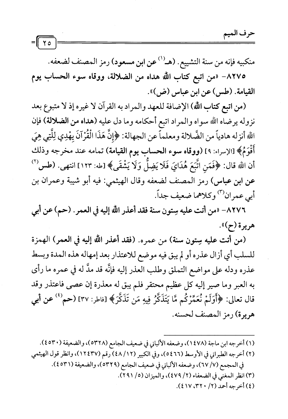 8276 - "من أتت عليه سِتون سنة فقد أعذر الله إليه في العمر. (حم) عن أبي هريرة (ح) ".
