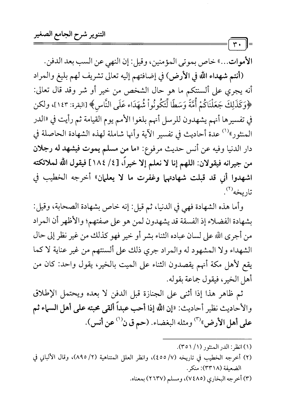 الأموات ... " خاص بموتى المؤمنين، وقيل: إن النهي عن السب بعد الدفن. (أنتم شهداء الله في الأرض) في إضافتهم إليه تعالى تشريف لهم بليغ والمراد أنه يجري على ألسنتكم ما هو حال الشخص من خير أو شر وقد قال تعالى: {وَكَذَلِكَ جَعَلْنَاكُمْ أُمَّةً وَسَطًا لِّتكُونُواْ شُهَدَاء عَلَى النَّاسِ} [البقرة: 143]، ولكن في تفسيرها أنهم يشهدون للرسل أنهم بلغوا الأمم يوم القيامة ثم رأيت في "الدر المنثور" (¬1) عدة أحاديث في تفسير الآية وأنها شاملة لهذه الشهادة الحاصلة في دار الدنيا وفيه عن أنس حديث مرفوع: "ما من مسلم يموت فيشهد له رجلان من جيرانه فيقولان: اللهم إنا لا نعلم إلا خيراً، [4/ 184] فيقول الله لملائكته اشهدوا أني قد قبلت شهادتهما وغفرت ما لا يعلمان" أخرجه الخطيب في تاريخه (¬2).