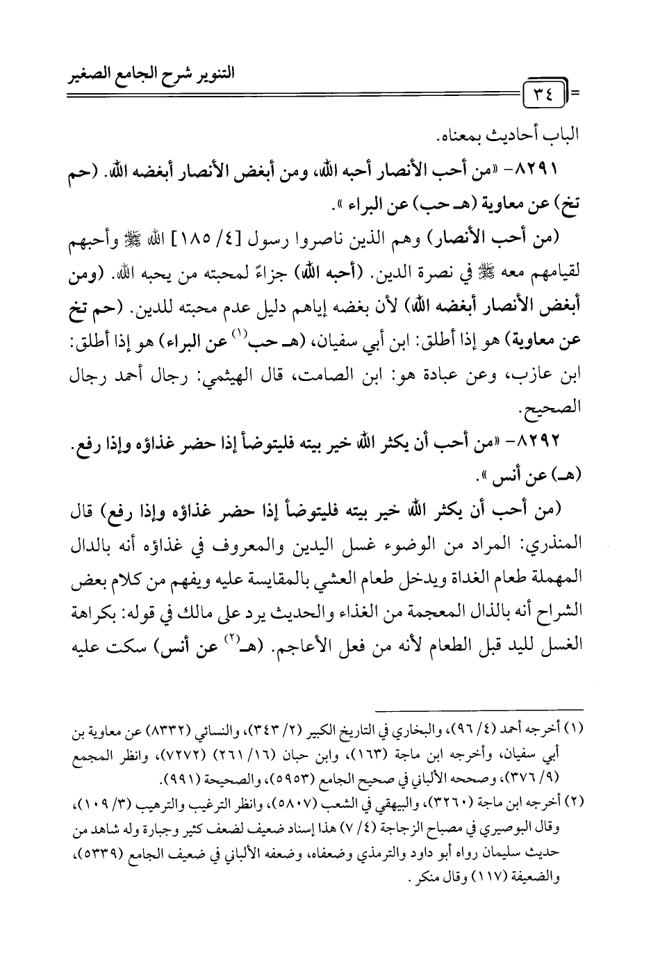 8291 - "من أحب الأنصار أحبه الله، ومن أبغض الأنصار أبغضه الله. (حم تخ) عن معاوية (هـ حب) عن البراء".
