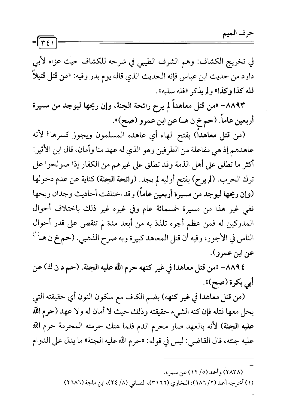 8893 - "من قتل معاهدًا لم يرح رائحة الجنة، وإن ريحها ليوجد من مسيرة أربعين عامًا. (حم خ ن هـ) عن ابن عمرو (صح) ".