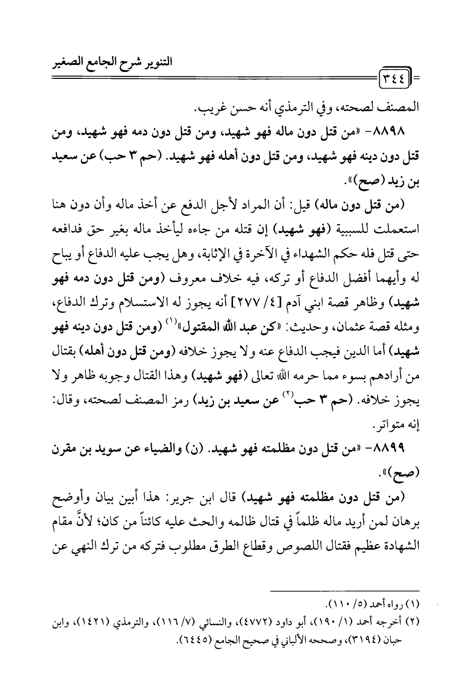 8898 - "من قتل دون ماله فهو شهيد، ومن قتل دون دمه فهو شهيد، ومن قتل دون دينه فهو شهيد، ومن قتل دون أهله فهو شهيد. (حم 3 حب) عن سعيد بن زيد (صح) ".