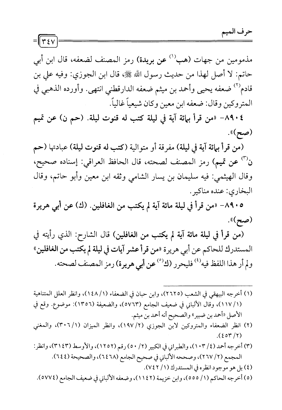 8904 - "من قرأ بمائة آية في ليلة كتب له قنوت ليلة. (حم ن) عن تميم (صح) ".