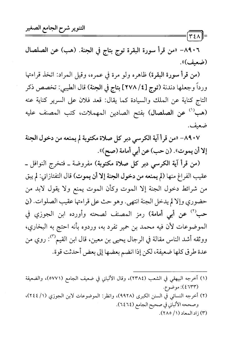 8907 - "من قرأ آية الكرسي دبر كل صلاة مكتوبة لم يمنعه من دخول الجنة إلا أن يموت". (ن حب) عن أبي أمامة (صح) ".