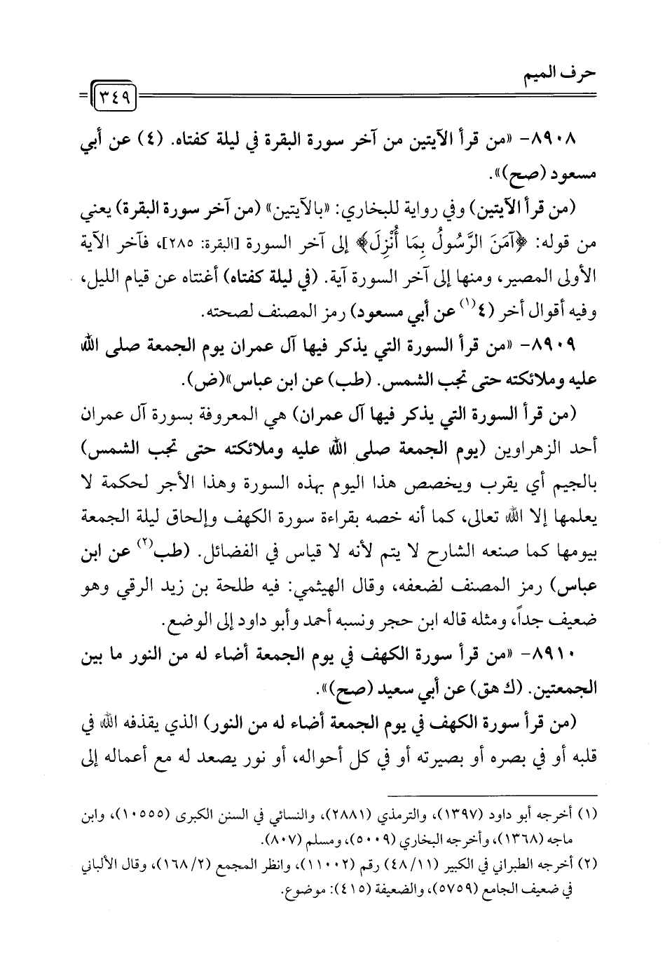 8910 - "من قرأ سورة الكهف في يوم الجمعة أضاء له من النور ما بين الجمعتين. (ك هق) عن أبي سعيد (صح) ".