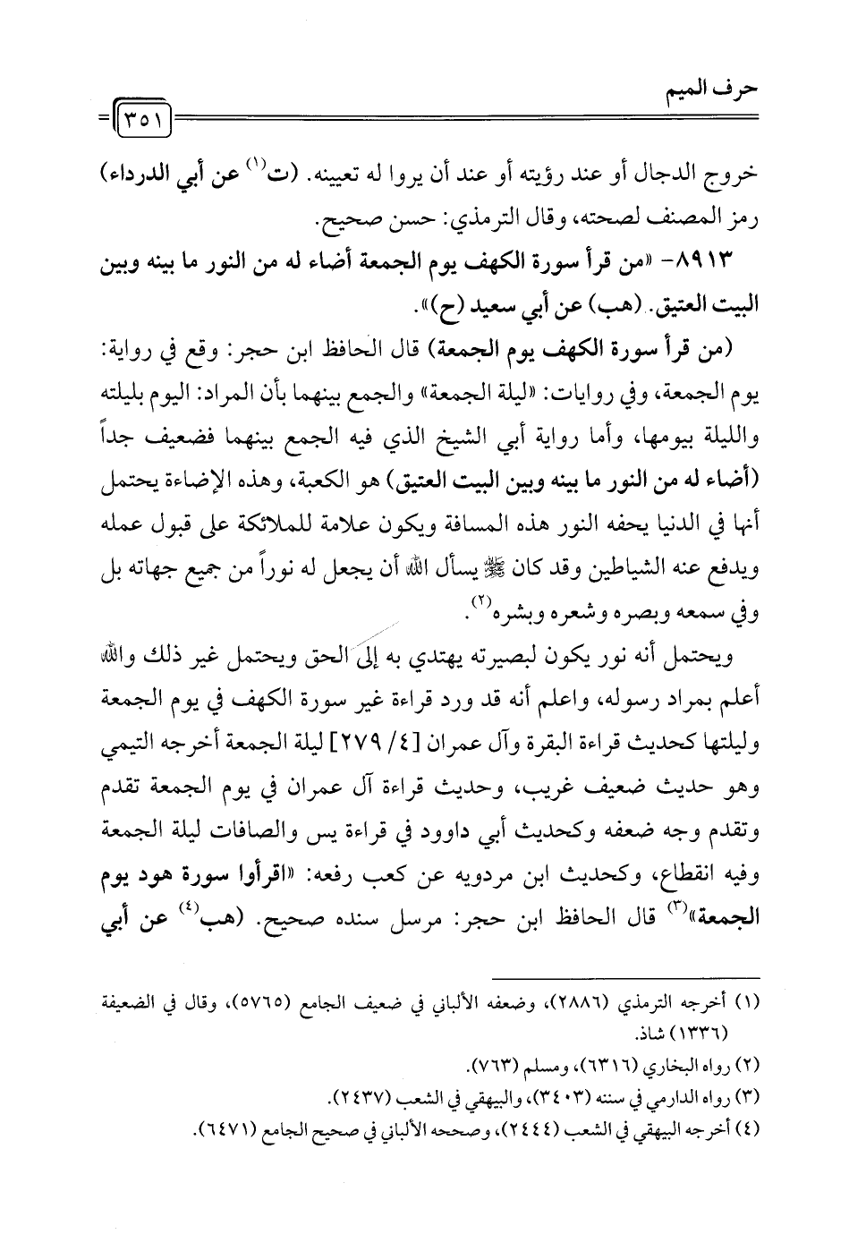 8913 - "من قرأ سورة الكهف يوم الجمعة أضاء له من النور ما بينه وبين البيت العتيق. (هب) عن أبي سعيد (ح) ".