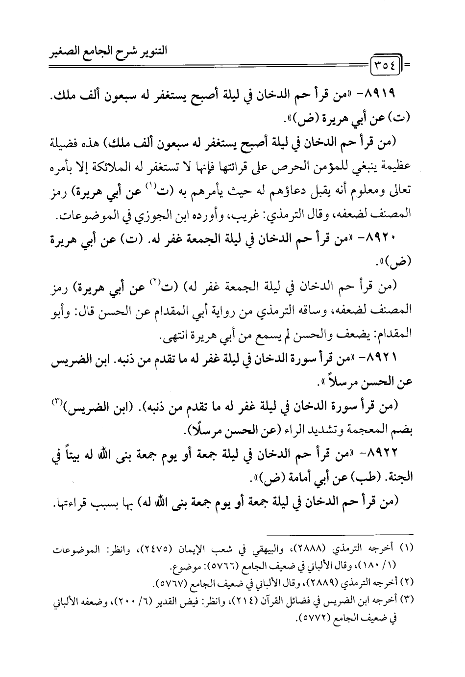 8920 - "من قرأ حم الدخان في ليلة الجمعة غفر له. (ت) عن أبي هريرة (ض) ".