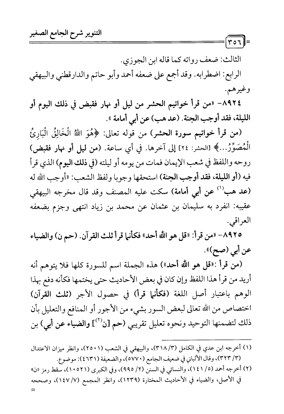 8924 - "من قرأ خواتيم الحشر من ليل أو نهار فقبض في ذلك اليوم أو الليلة, فقد أوجب الجنة. (عد هب) عن أبي أمامة".