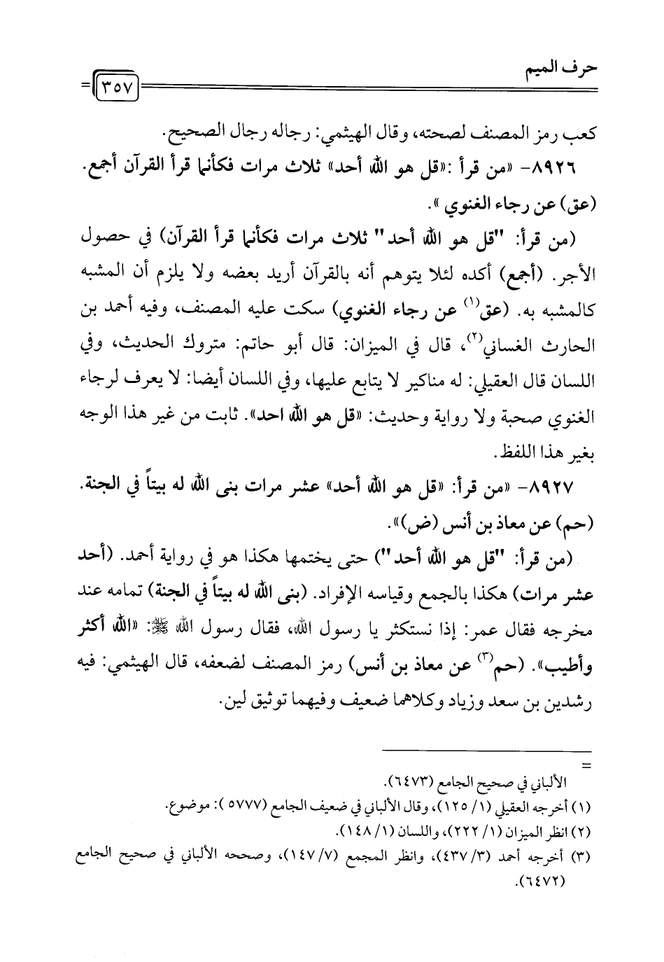8926 - "من قرأ: "قل هو الله أحد" ثلاث مرات فكأنما قرأ القرآن أجمع. (عق) عن رجاء الغنوي".