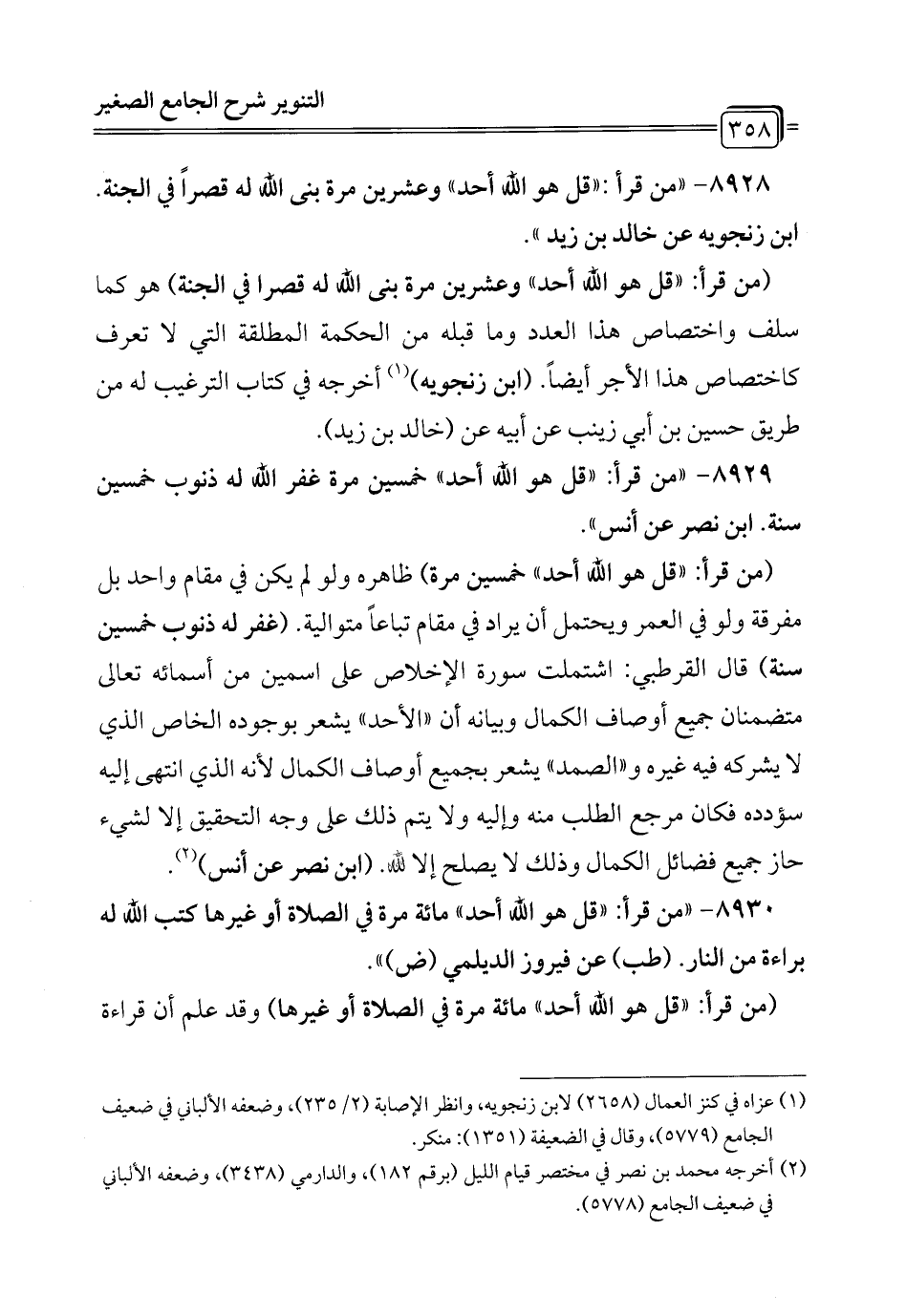 8928 - "من قرأ: "قل هو الله أحد" وعشرين مرة بنى الله له قصرًا في الجنة. ابن زنجويه عن خالد بن زيد".