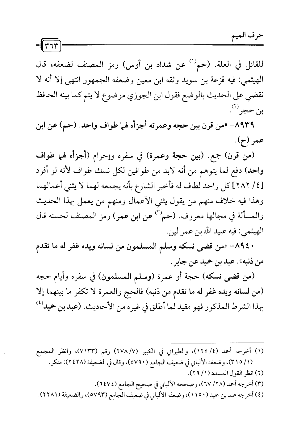 8939 - "من قرن بين حجه وعمرته أجزأه لهما طواف واحد. (حم) عن ابن عمر (ح).