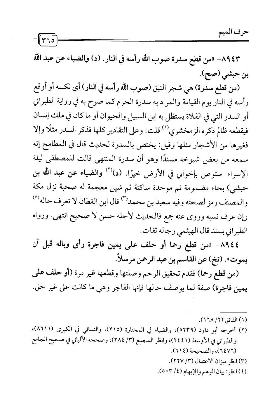 8943 - "من قطع سدرة صوب الله رأسه في النار. (د) والضياء عن عبد الله بن حبشي (صح).