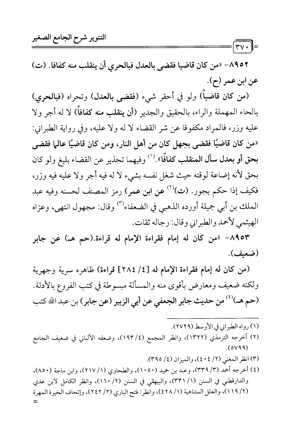 8952 - "من كان قاضيًا فقضى بالعدل فبالحري أن ينقلب منه كفافًا. (ت) عن ابن عمر (ح).