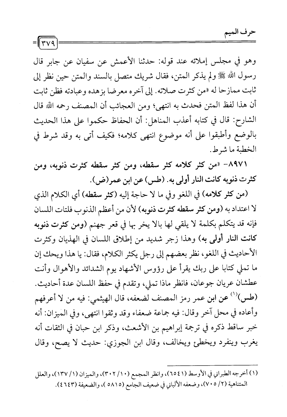 وهو في مجلس إملائه عند قوله: حدثنا الأعمش عن سفيان عن جابر قال رسول الله - صلى الله عليه وسلم - ولم يذكر المتن، فقال شريك متصل بالسند والمتن حين نظر إلى ثابت ممازحًا له "من كثرت صلاته. إلى آخره معرضًا بزهده وعبادته فظن ثابت أن هذا لفظ المتن فحدث به انتهى؛ ومن العجائب أن المصنف رحمه الله قال الشارح: قال في كتابه أعذب المناهل: أن الحفاظ حكموا على هذا الحديث بالوضع وأطبقوا على أنه موضوع انتهى كلامه؛ فكيف أتى به وقد شرط في الخطبة ما شرط.