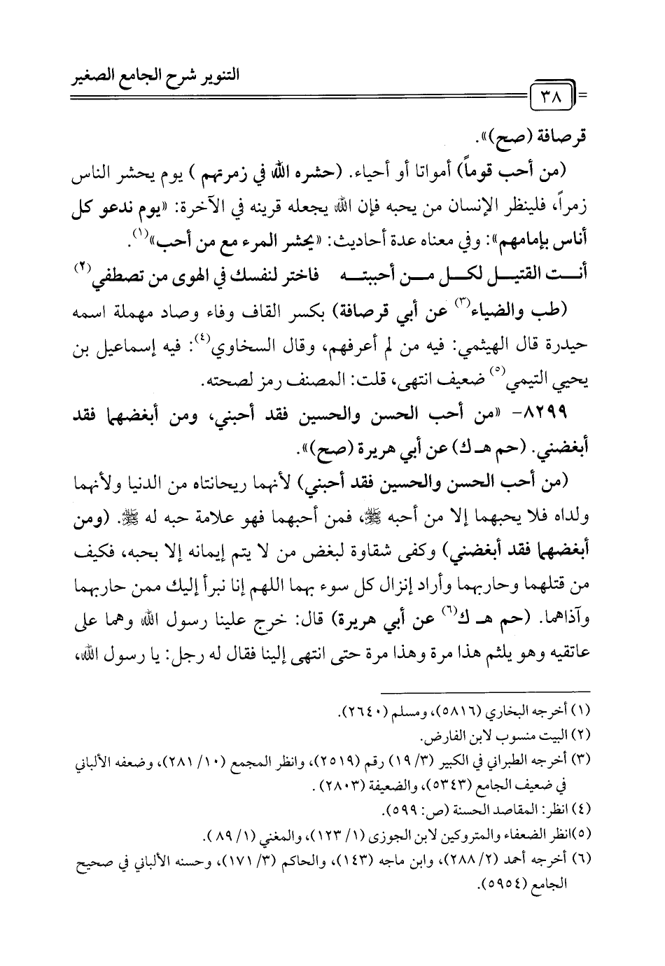 8299 - "من أحب الحسن والحسين فقد أحبني، ومن أبغضهما فقد أبغضني. (حم هـ ك) عن أبي هريرة (صح) ".