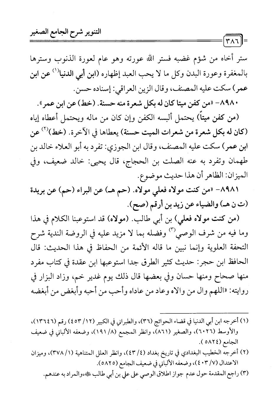 8980 - "من كفن ميتًا كان له بكل شعرة منه حسنة. (خط) عن ابن عمر".
