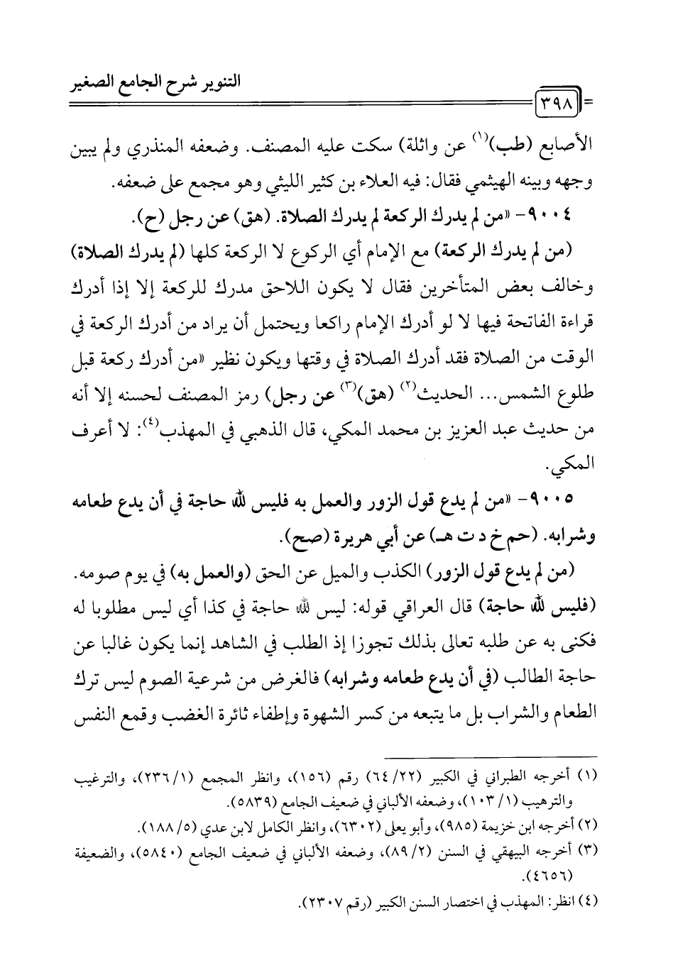 9005 - "من لم يدع قول الزور والعمل به فليس لله حاجة في أن يدع طعامه وشرابه. (حم خ د ت هـ) عن أبي هريرة (صح).
