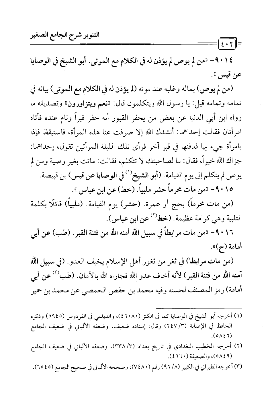 9014 - "من لم يوص لم يؤذن له في الكلام مع الموتى. أبو الشيخ في الوصايا عن قيس".