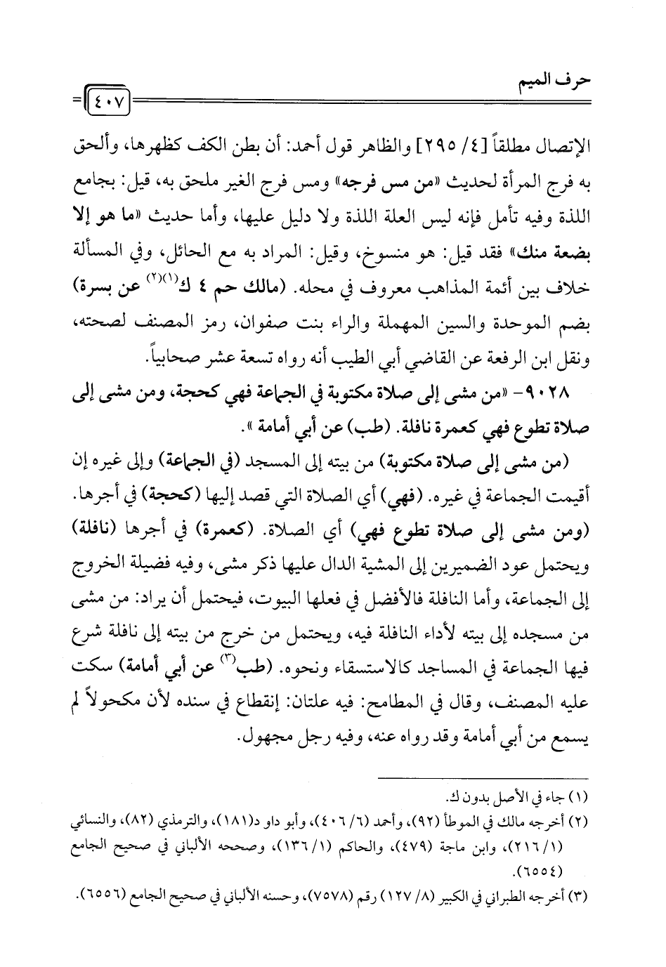 9028 - "من مشى إلى صلاة مكتوبة في الجماعة فهي كحجة، ومن مشى إلى صلاة تطوع فهي كعمرة نافلة. (طب) عن أبي أمامة".