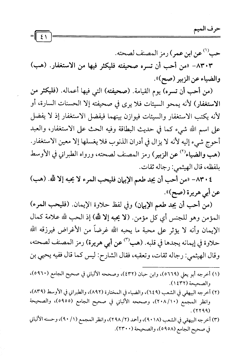 8303 - "من أحب أن تسره صحيفته فليكثر فيها من الاستغفار. (هب) والضياء عن الزبير (صح) ".