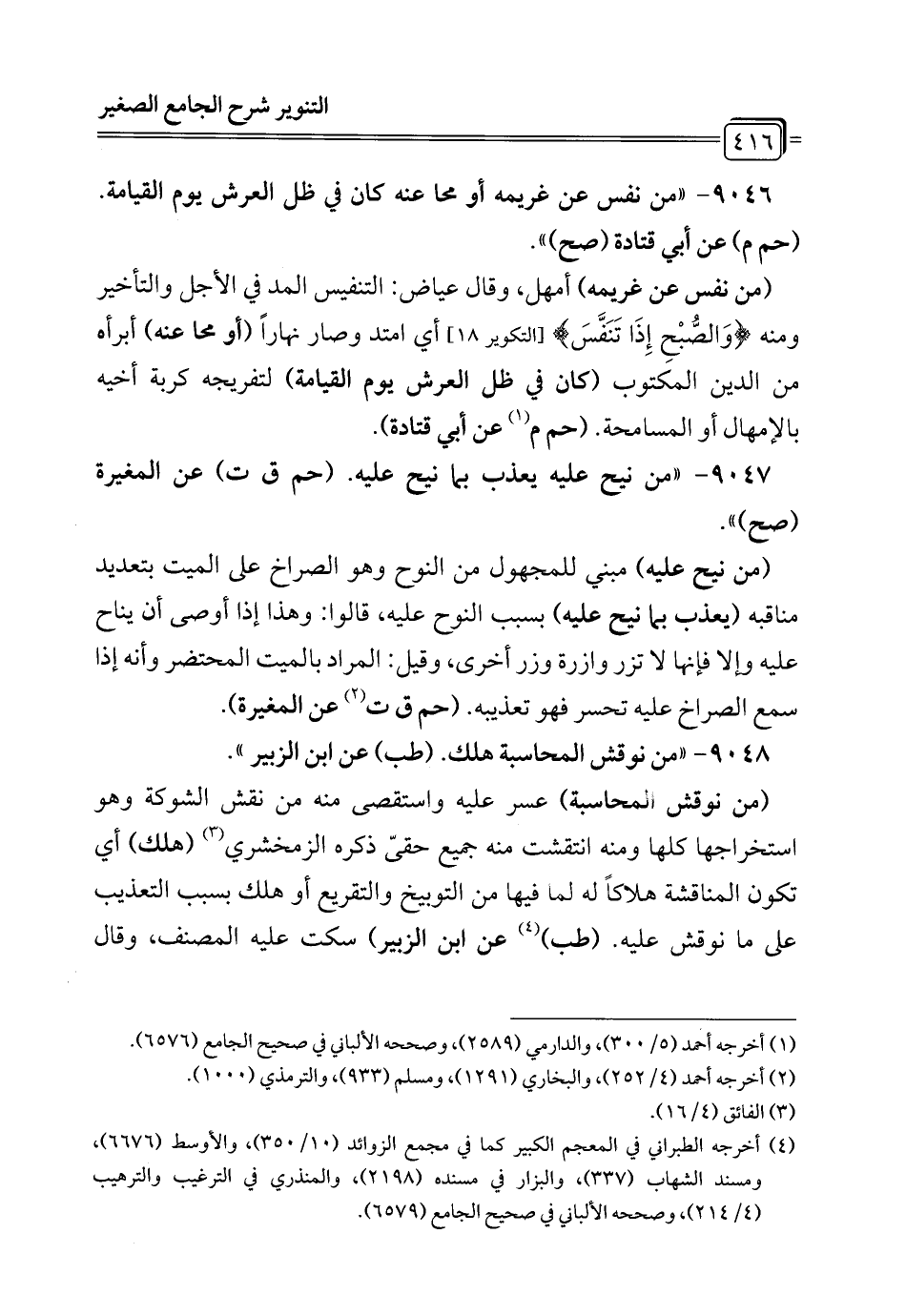 9046 - "من نفس عن غريمه أو محا عنه كان في ظل العرش يوم القيامة. (حم م) عن أبي قتادة (صح) ".