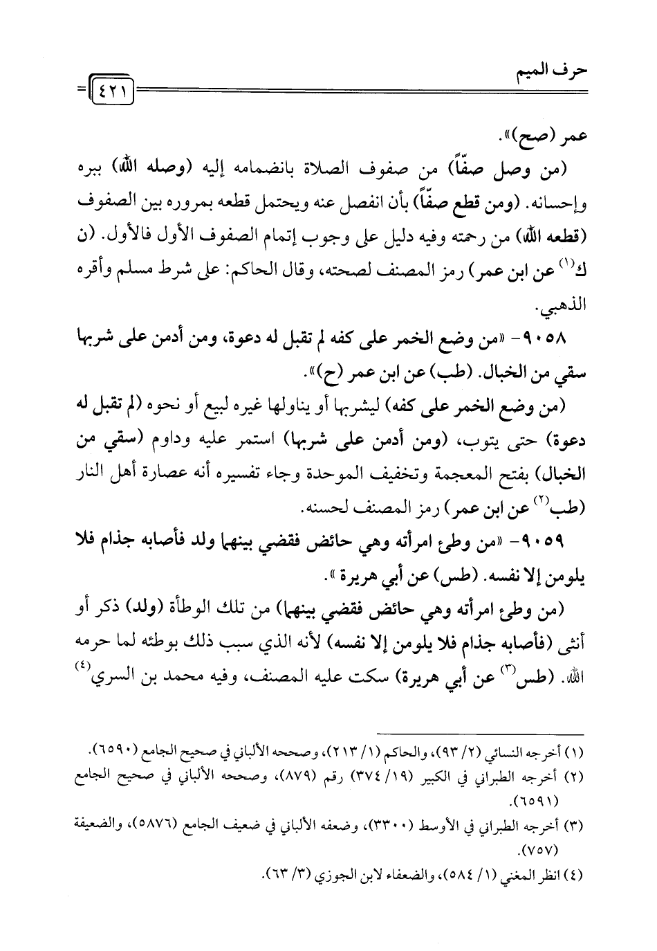 (من وطيء امرأته وهي حائض فقضي بينهما) من تلك الوطأة (ولد) ذكر أو أنثى (فأصابه جذام فلا يلومن إلا نفسه) لأنه الذي سبب ذلك بوطئه لما حرمه الله. (طس (¬3) عن أبي هريرة) سكت عليه المصنف، وفيه محمَّد بن السري (¬4)