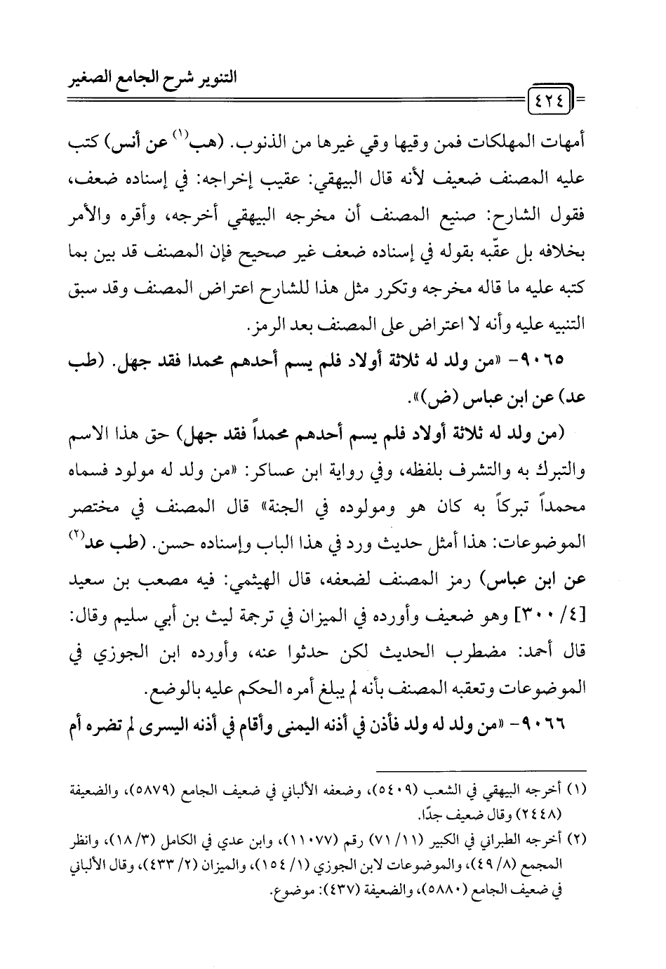 9065 - "من ولد له ثلاثة أولاد فلم يسم أحدهم محمدا فقد جهل. (طب عد) عن ابن عباس (ض) ".