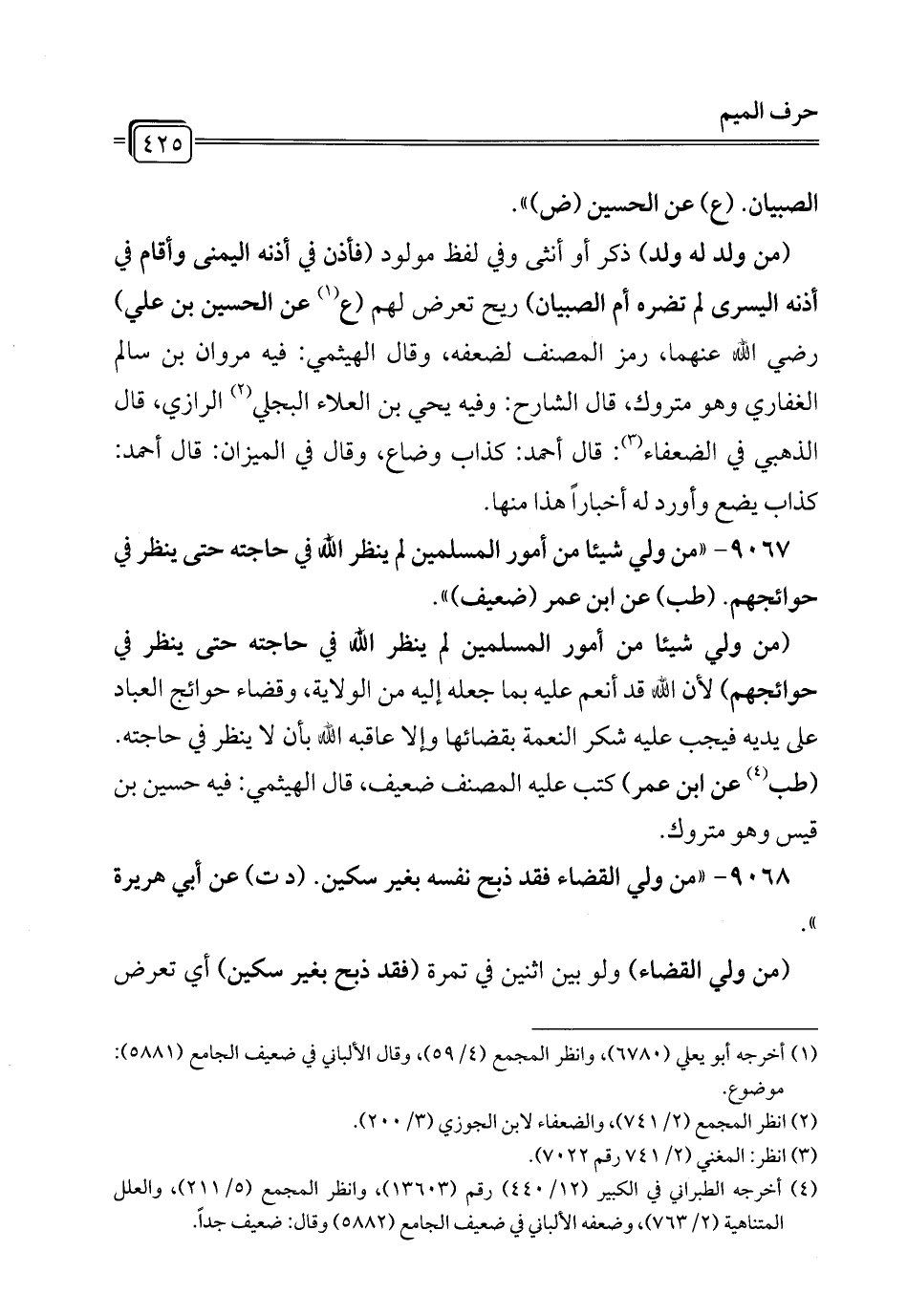 9067 - "من ولي شيئًا من أمور المسلمين لم ينظر الله في حاجته حتى ينظر في حوائجهم. (طب) عن ابن عمر (ضعيف) ".