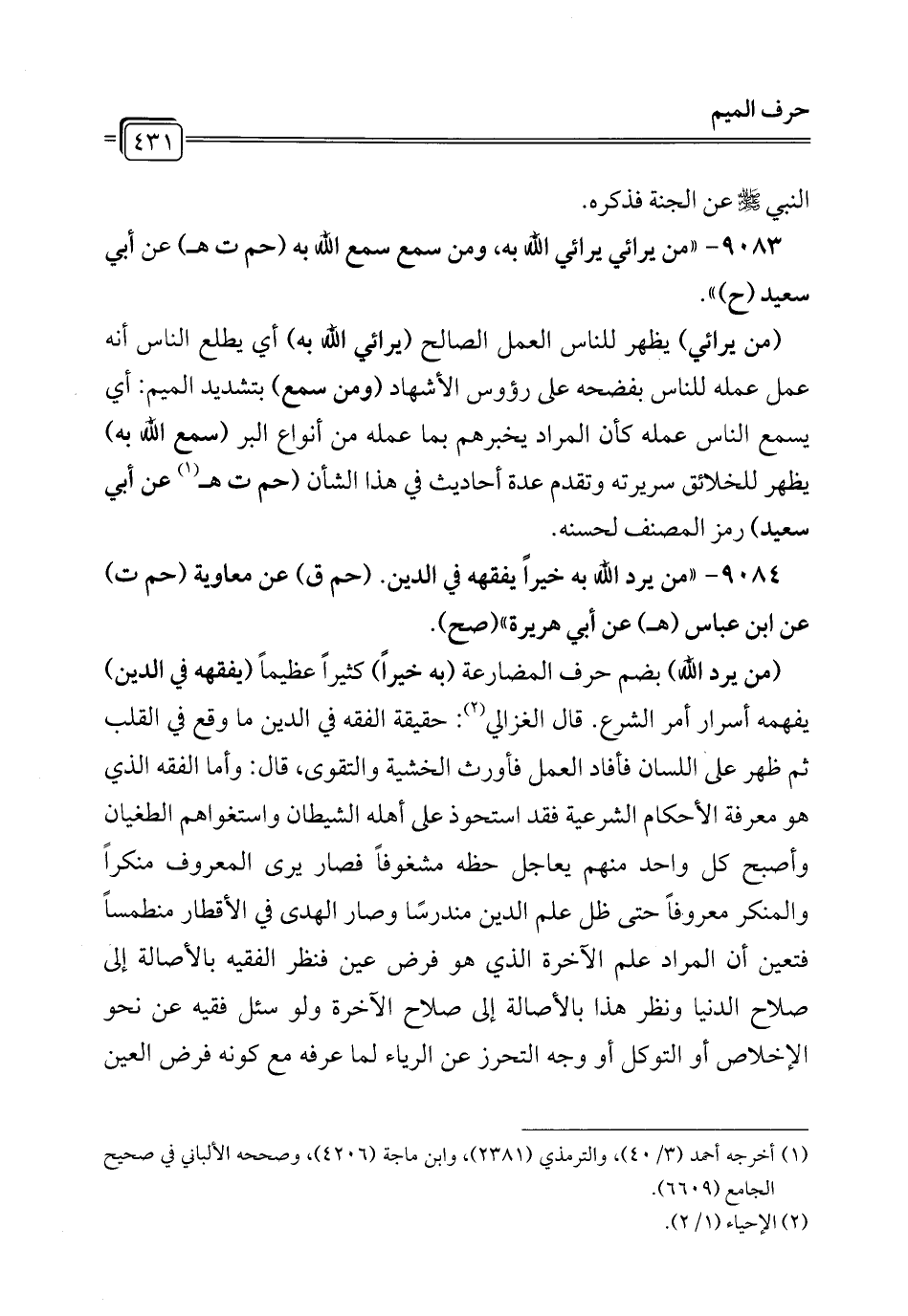 9084 - "من يرد الله به خيرًا يفقهه في الدين. (حم ق) عن معاوية (حم ت) عن ابن عباس (هـ) عن أبي هريرة" (صح).