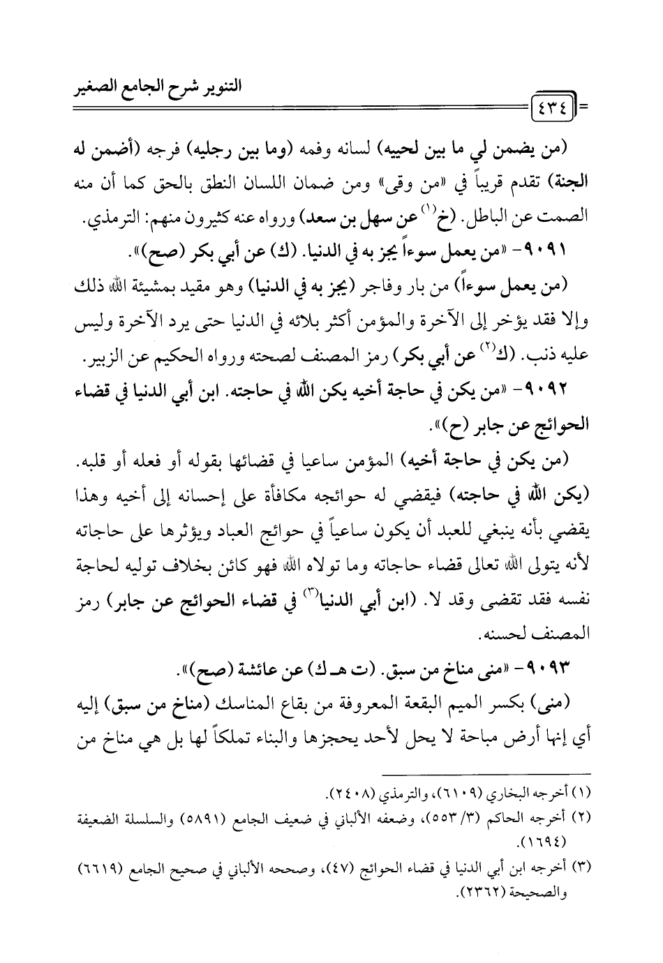 9092 - "من يكن في حاجة أخيه يكن الله في حاجته. ابن أبي الدنيا في قضاء الحوائج عن جابر (ح) ".