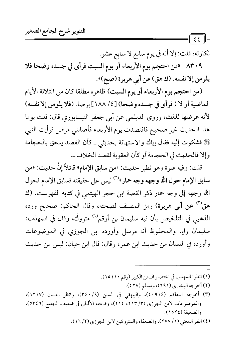 8309 - "من احتجم يوم الأربعاء أو يوم السبت فرأى في جسده وضحا فلا يلومن إلا نفسه. (ك هق) عن أبي هريرة (صح) ".