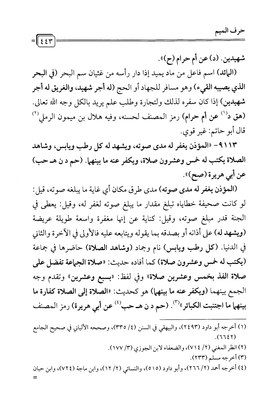 9113 - "المؤذن يغفر له مدى صوته، ويشهد له كل رطب ويابس، وشاهد الصلاة يكتب له خمس وعشرون صلاة، ويكفر عنه ما بينهما. (حم د ن هـ حب) عن أبي هريرة (صح) ".