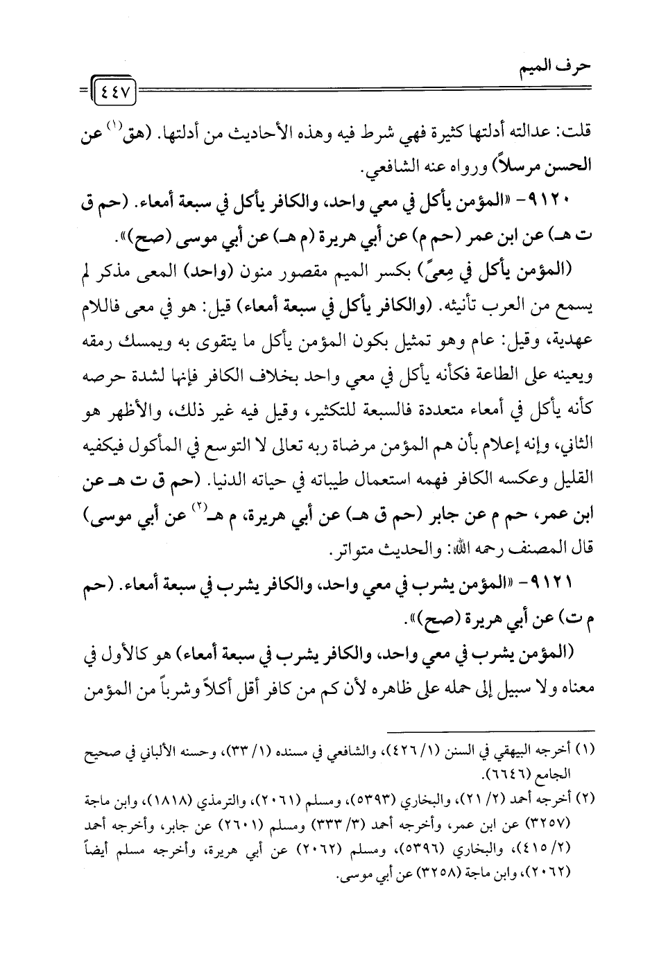 9120 - "المؤمن يأكل في معي واحد، والكافر يأكل في سبعة أمعاء. (حم ق ت هـ) عن ابن عمر (حم م) عن أبي هريرة (م هـ) عن أبي موسى (صح) ".