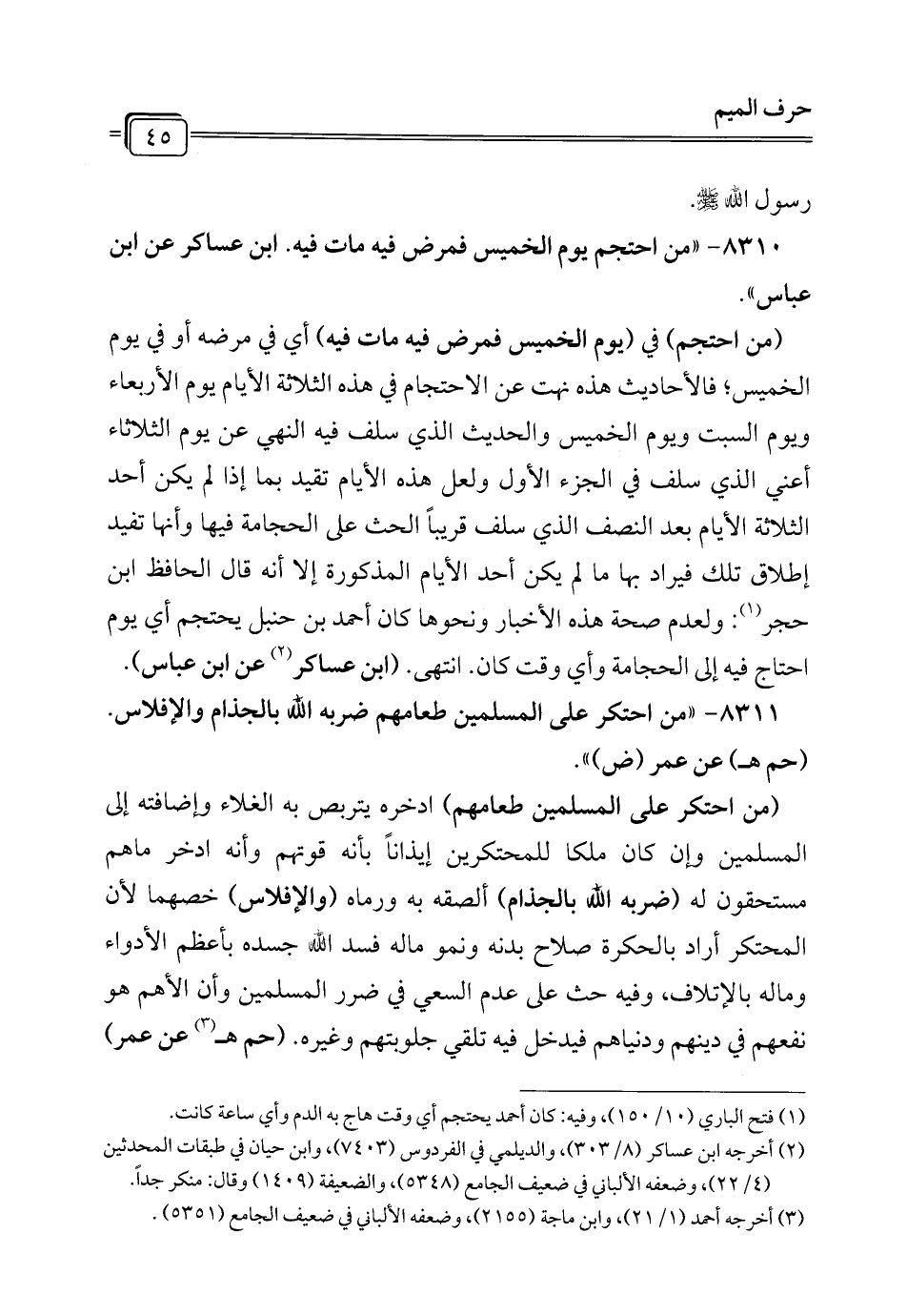 8311 - "من احتكر على المسلمين طعامهم ضربه الله بالجذام والإفلاس. (حم هـ) عن عمر (ض) ".