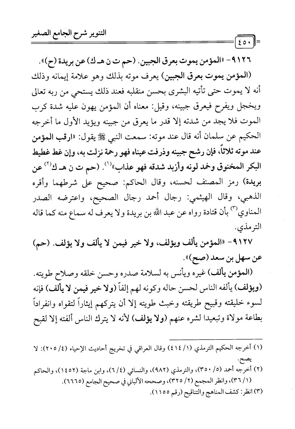 9126 - "المؤمن يموت بعرق الجبين. (حم ت ن هـ ك) عن بريدة (ح) ".