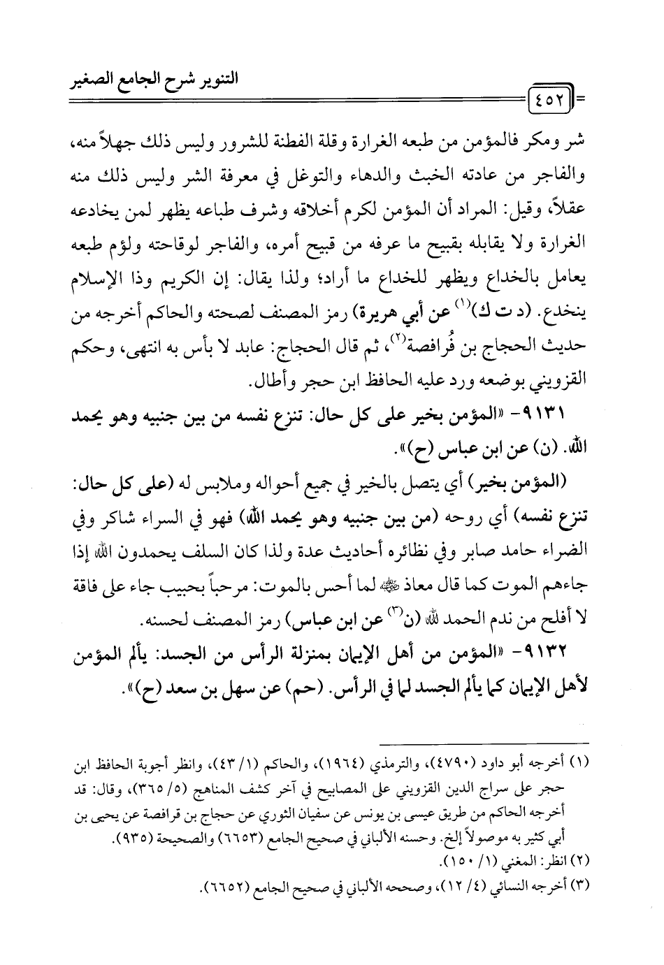 9131 - "المؤمن بخير على كل حال: تنزع نفسه من بين جنبيه وهو يحمد الله. (ن) عن ابن عباس (ح) ".
