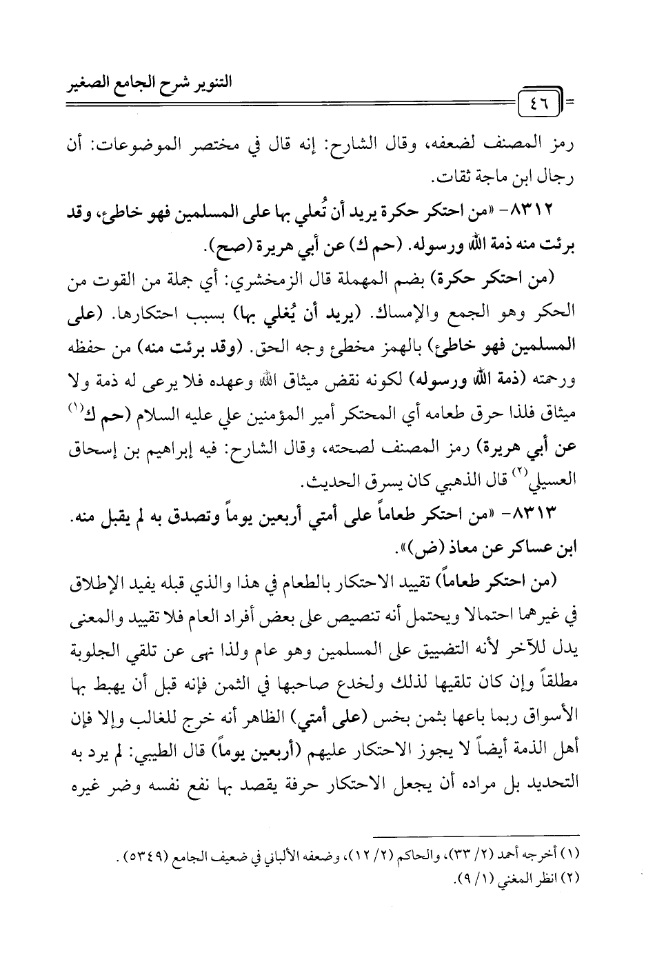 8312 - "من احتكر حكرة يريد أن تُعلي بها على المسلمين فهو خاطئ، وقد برئت منه ذمة الله ورسوله. (حم ك) عن أبي هريرة (صح).