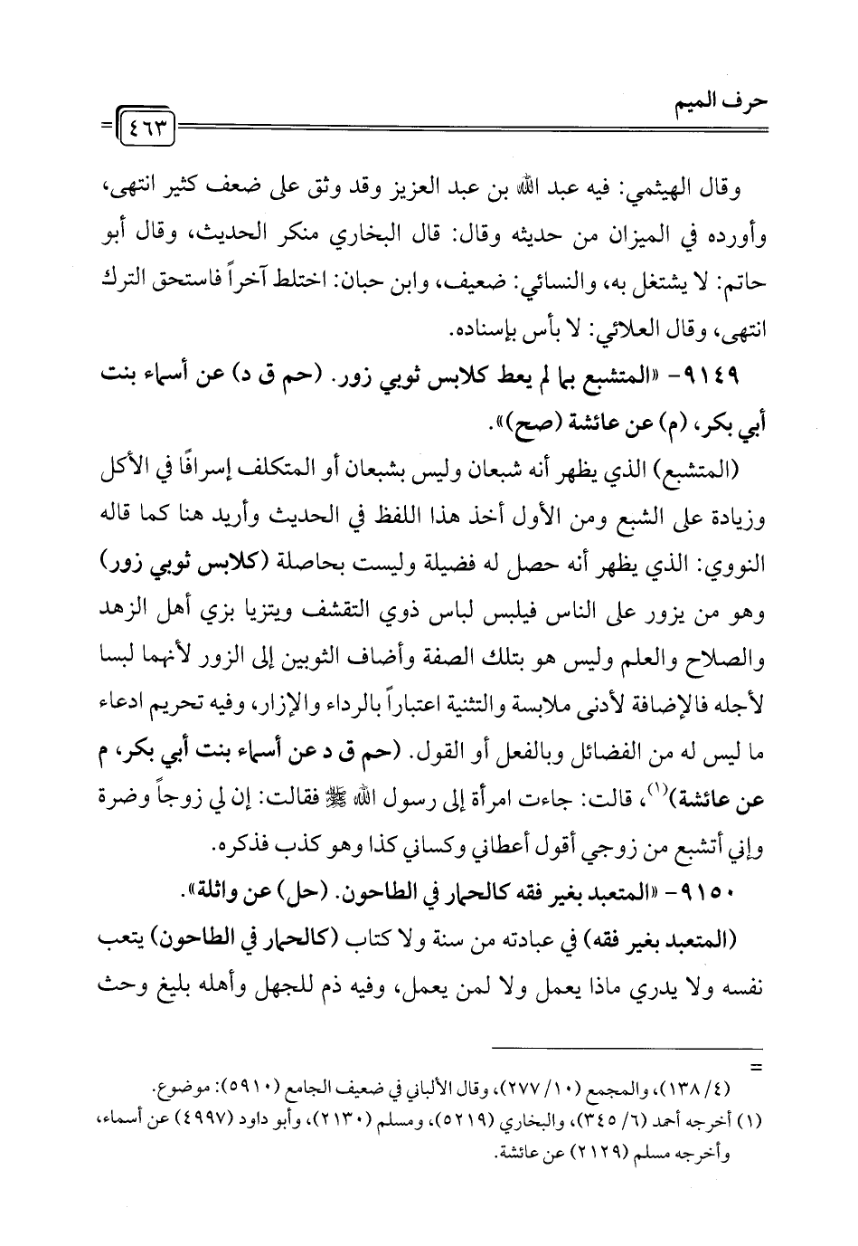 9149 - "المتشبع بما لم يعط كلابس ثوبي زور. (حم ق د) عن أسماء بنت أبي بكر، (م) عن عائشة (صح) ".