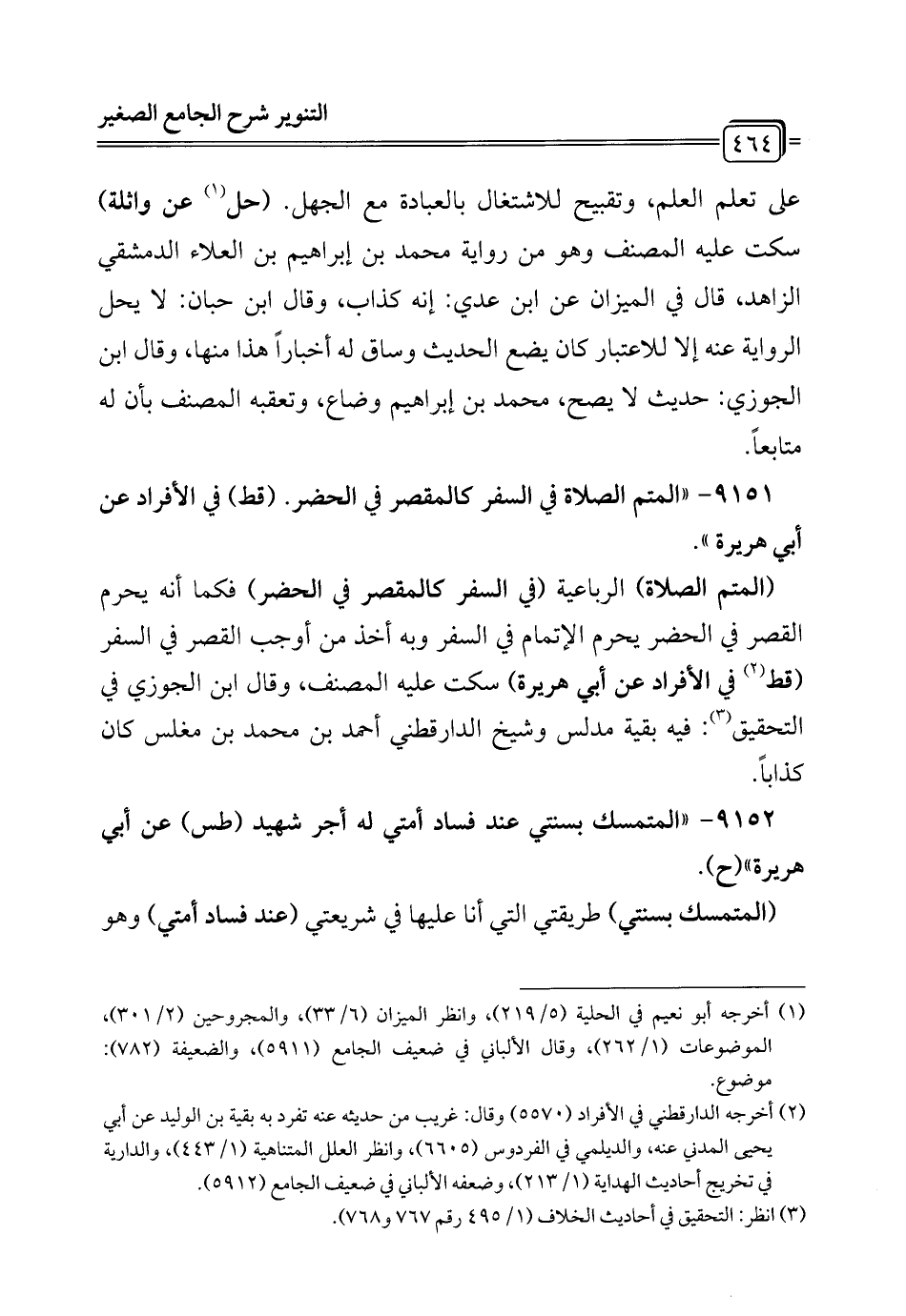 9151 - "المتم الصلاة في السفر كالمقصر في الحضر. (قط) في الأفراد عن أبي هريرة".