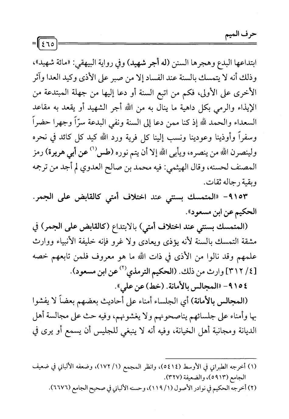 9153 - "المتمسك بسنتي عند اختلاف أمتي كالقابض على الجمر. الحكيم عن ابن مسعود".