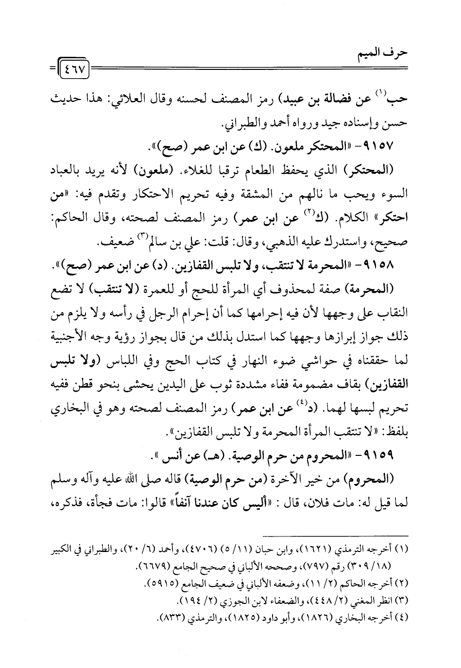 9158 - "المحرمة لا تنتقب، ولا تلبس القفازين. (د) عن ابن عمر (صح) ".