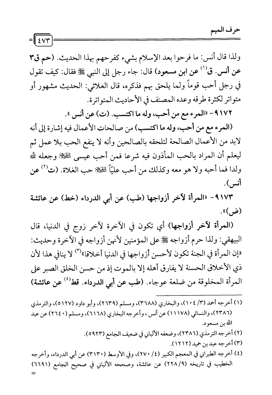 ولذا قال أنس: ما فرحوا بعد الإِسلام بشيء كفرحهم بهذا الحديث. (حم ق 3 عن أنس. ق (¬1) عن ابن مسعود) قال: جاء رجل إلى النبي - صلى الله عليه وسلم - فقال: كيف تقول في رجل أحب قومًا ولما يلحق بهم فذكره، قال العلائي: الحديث مشهور أو متواتر لكثرة طرقه وعده المصنف في الأحاديث المتواترة.