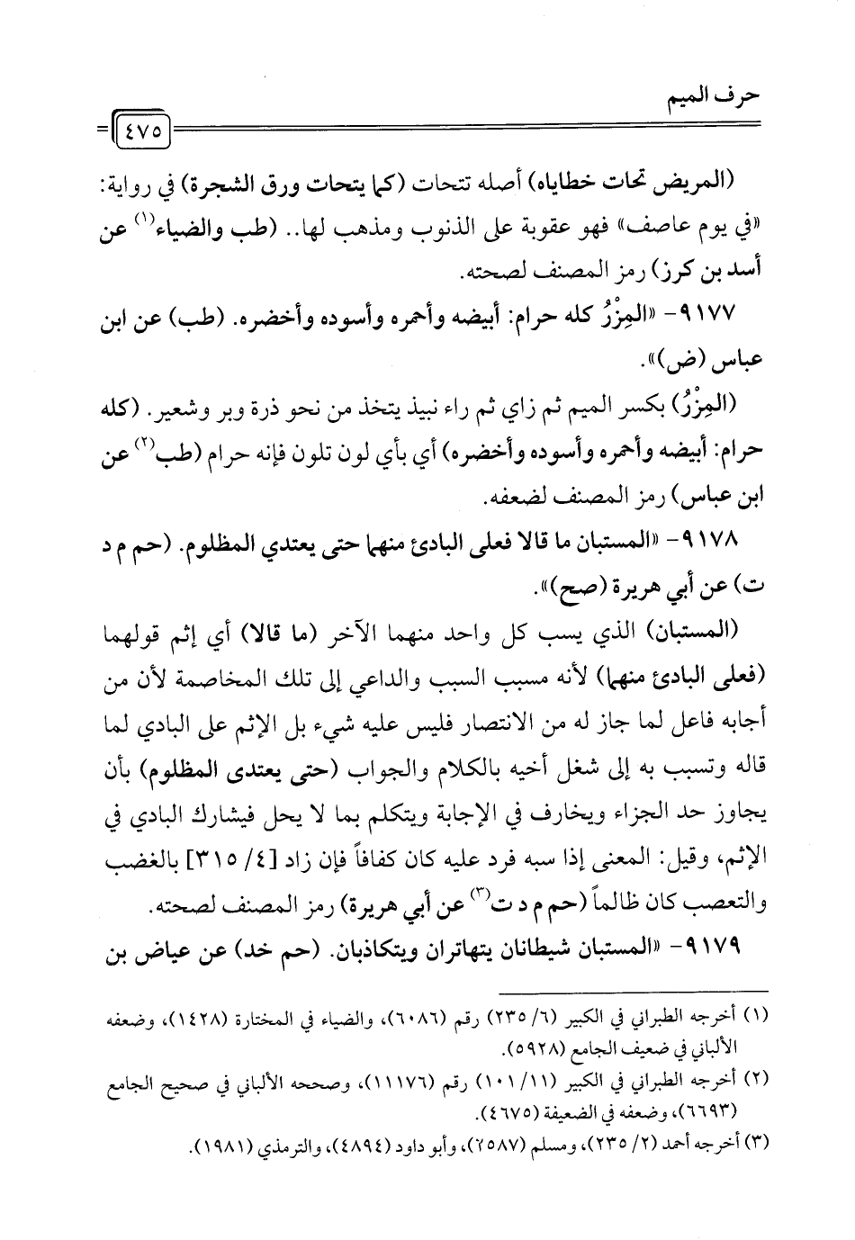 9177 - "المِزْرُ كله حرام: أبيضه وأحمره وأسوده وأخضره. (طب) عن ابن عباس (ض) ".