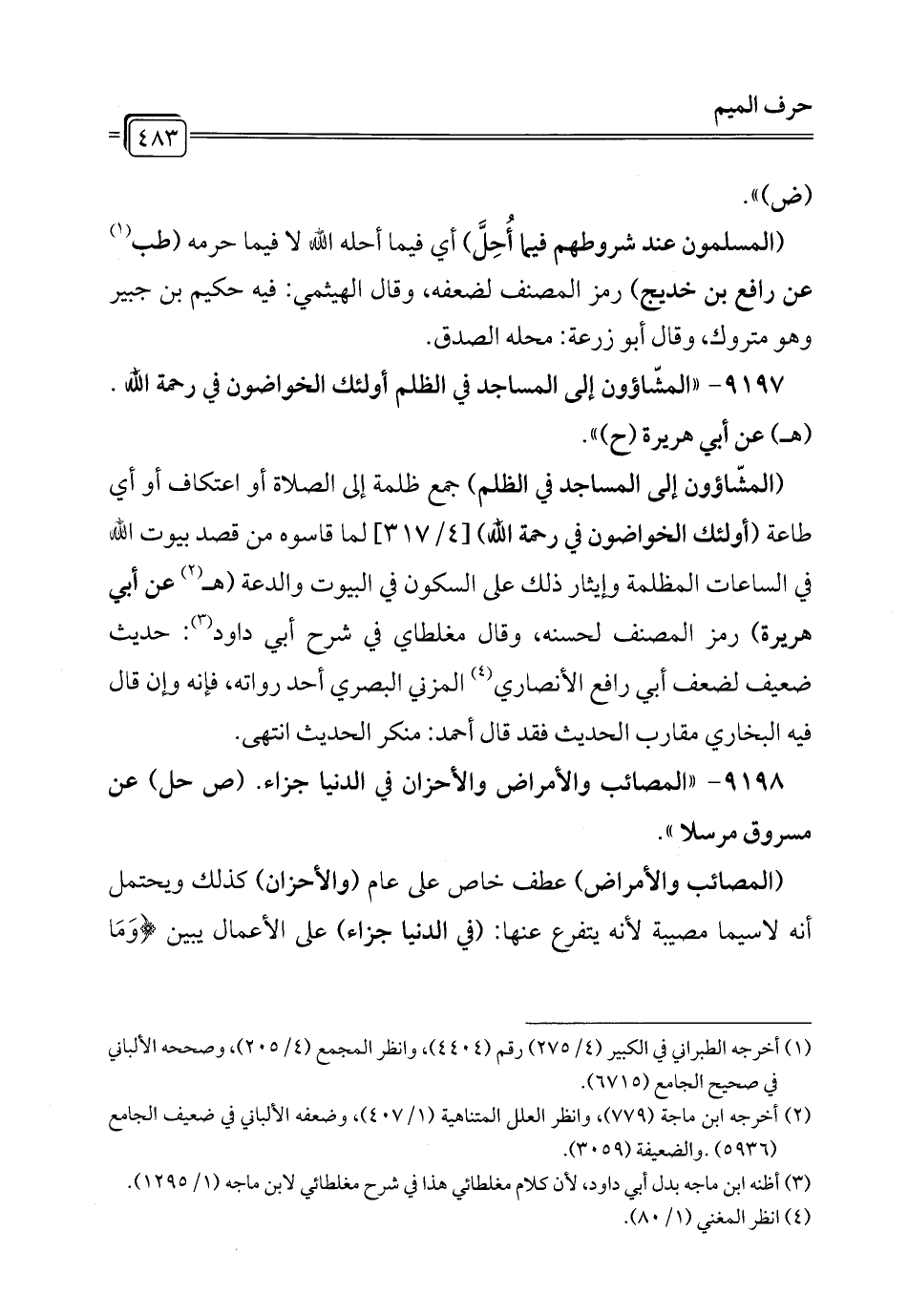 9197 - "المشّاؤون إلى المساجد في الظلم أولئك الخواضون في رحمة الله. (هـ) عن أبي هريرة (ح) ".