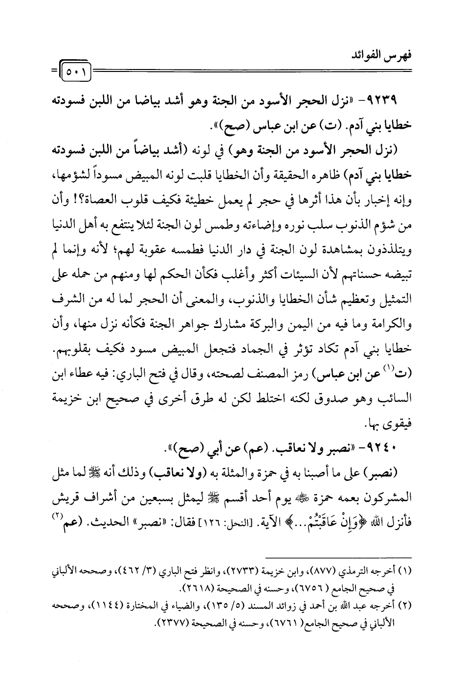 9239 - "نزل الحجر الأسود من الجنة وهو أشد بياضا من اللبن فسودته خطايا بني آدم. (ت) عن ابن عباس (صح) ".