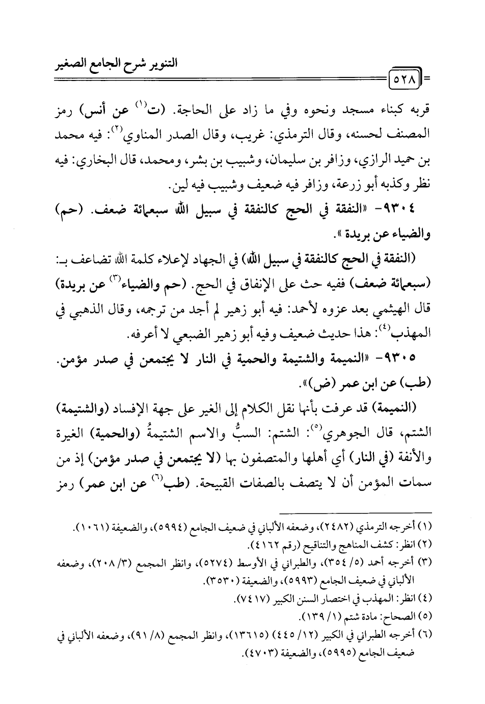 9305 - "النميمة والشتيمة والحمية في النار لا يجتمعن في صدر مؤمن. (طب) عن ابن عمر (ض) ".